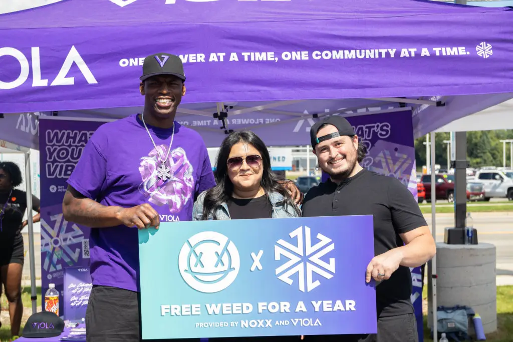Viola Brands Founder, Al Harrington, congratulates Free Weed for a Year winning customer at the NOXX 28th St. Grand Opening
